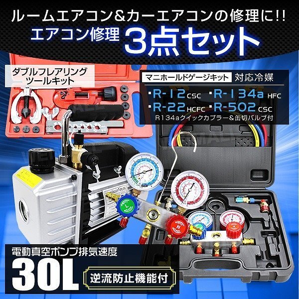 - エアコンガスチャージ 3点セット 電動真空ポンプ マニホールドゲージ フレアリングツール R134a R12 R22 R502 エアコン ガス 補充 修理
