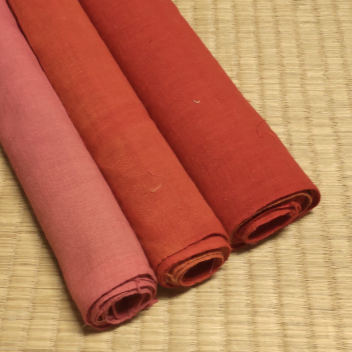 - 【時代布】古布 木綿 紅花 ピンク 赤 3枚 合計約320cm 生地 古裂 アンティーク リメイク素材 A-2456