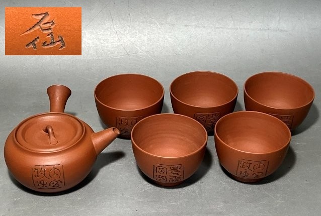 - 煎茶道具 常滑焼 石仙 造 朱泥 漢詩彫文 急須 湯呑5客 茶注 茶器