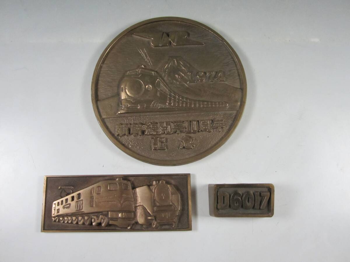 > 《阡》昭和レトロ JNR 国鉄 鉄道記念品3点 1974年 東海道新幹線10周年 真鍮プレート 銘板 機関車モチーフ D6017文鎮? 貴重コレクション