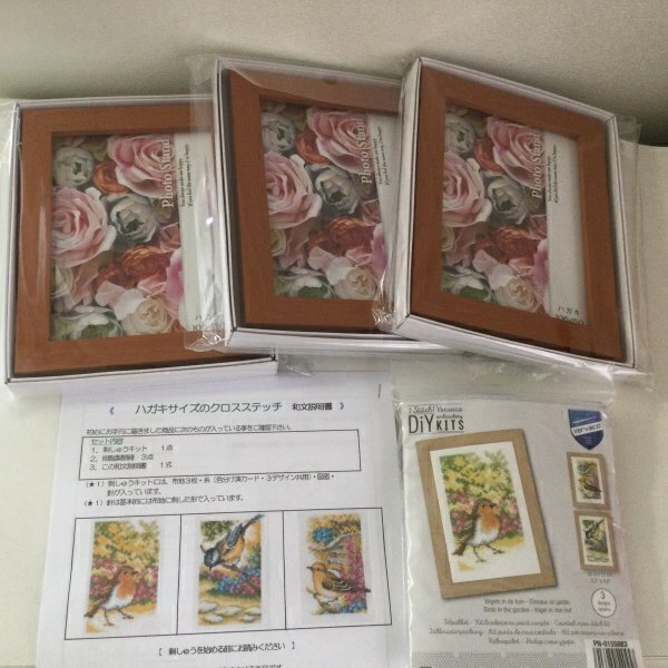 - ZB335-1 はがきサイズの クロスステッチ 3点セット 額3点付き 日本語図解つき Vervacoミニチュアの野鳥のセット3