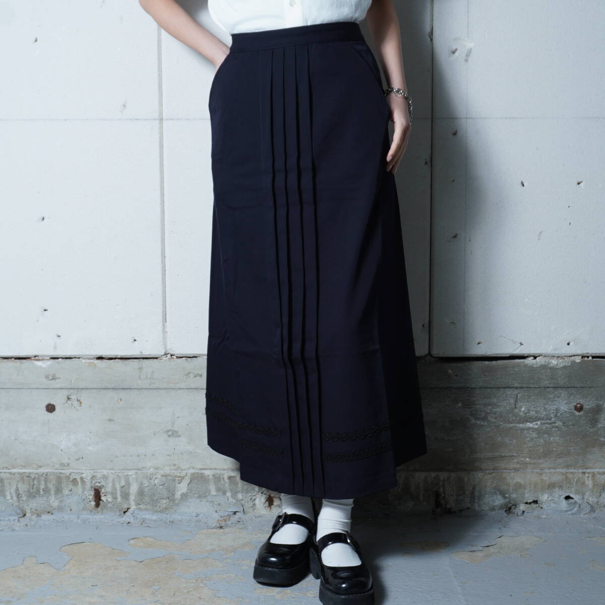 > 【COMME des GARONS】コムデギャルソン 97年製 極美品 タグ付WOOL100%刺ロングスカート dark navy