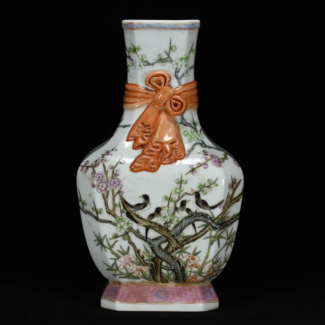 - 『館蔵珍品 清 乾隆年製款 古陶瓷品 粉彩 喜鵲鬧梅紋 帶方瓶 陶芸』稀少珍蔵品 古賞物 貴重物品 収蔵品 中国古美術 時代物 古董品