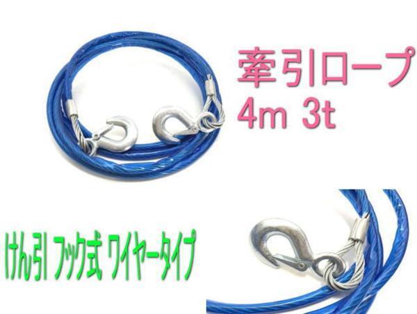 > 牽引ロープ 車を引っ張る 長さ4m ワイヤー径8mm 安全荷重3t 破断張力5t フック式 ワイヤータイプ 白旗・簡易収納ケース付き 新品