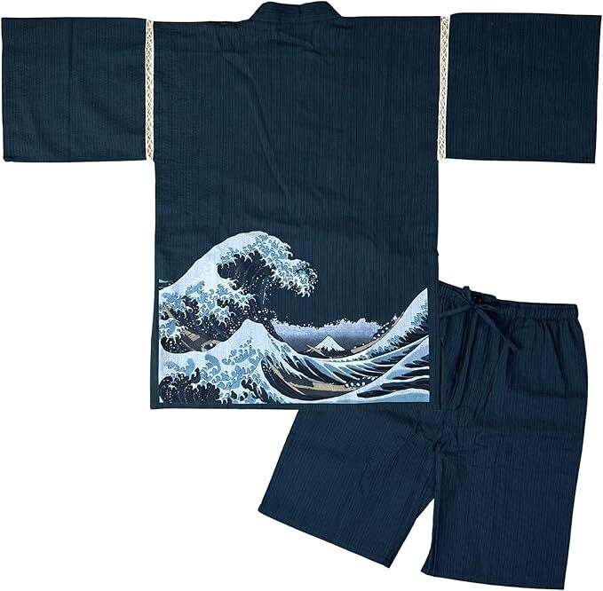 - [江戸てん]LL 訳あり 甚平 しじら織り 涼しい 綿100% 捺染 メンズ 北斎 波 紺