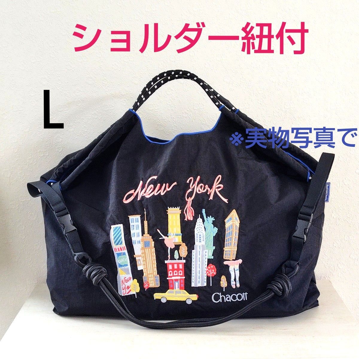 - L ニューヨーク 黒 刺繍 エコバッグ ストラップ付き ショルダーベルト付 トートバッグ ブラック