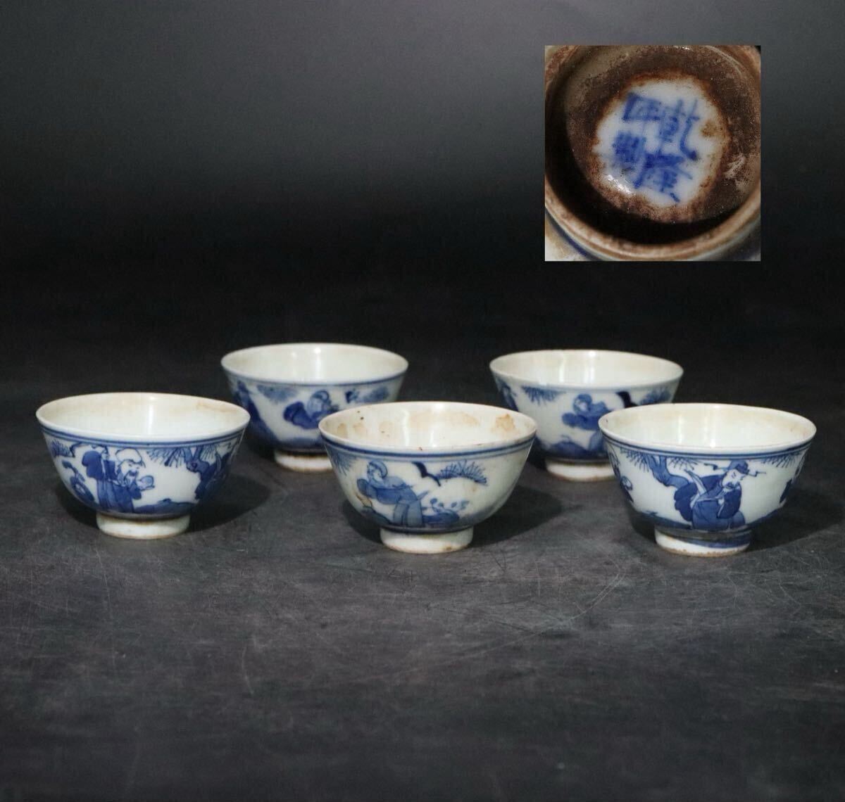 > 時代「 乾隆年製 」 款 青花 人物 染付 煎茶碗 5客 / 中国美術 清 乾隆 新渡 煎茶道具 .B1235
