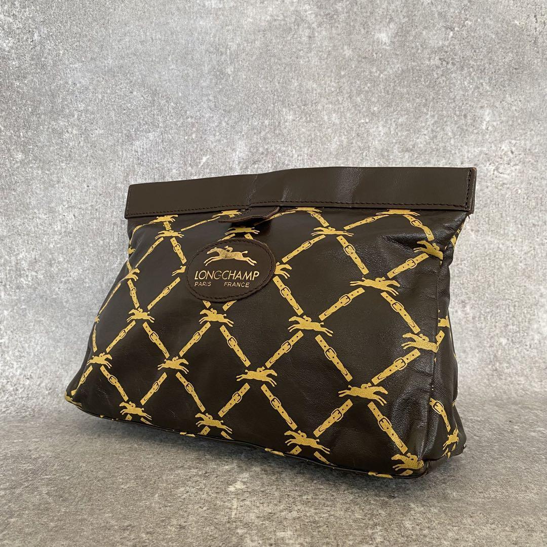 - ロンシャン クラッチバッグ ナイロン ロゴ レザー 千鳥柄 ブラウン 茶色