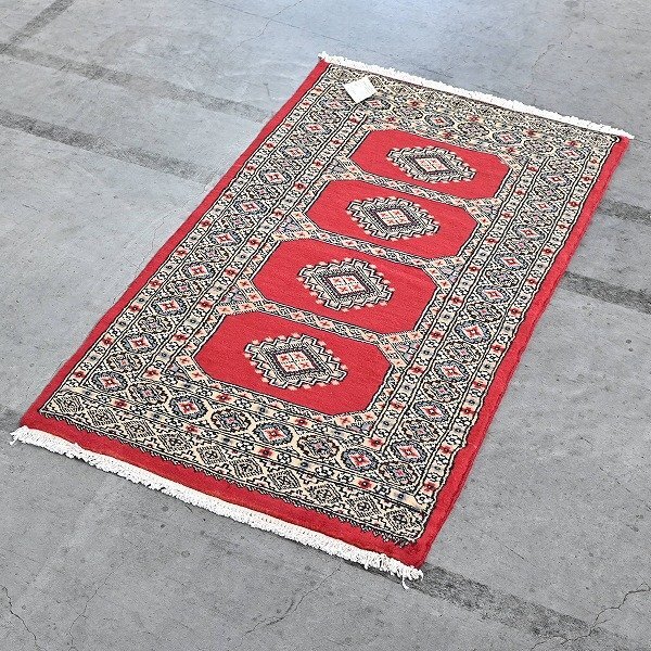 > 新品 未使用 パキスタン製 手織り ウール絨毯 ラグ ボハラ柄 ギュル文様 ハンドノット 羊毛 カーペット マット ホテル 応接室 P-97