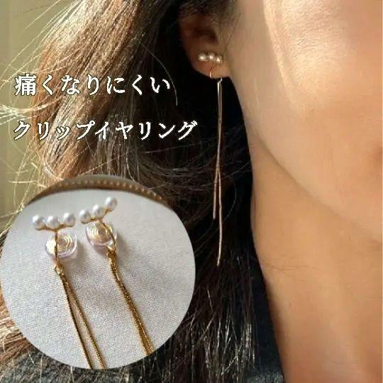 - パール ゴールド フリンジ 揺れる 痛くなりにくい クリップ イヤリング 小ぶり