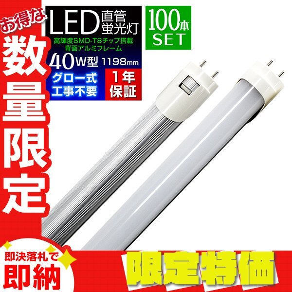 - 【限定セール 100本セット】新品 1年保証 LED蛍光灯 昼光色 40W型 1198mm 約120cm 直管 SMD グロー式 工事不要 照明 店舗 オフィス 省エネ