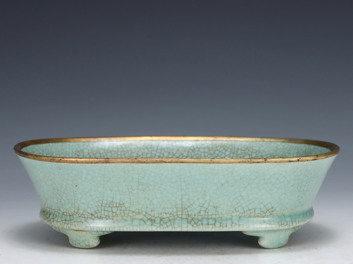 - ▽鴻▽宋時代 陶磁器 汝窯青釉包金口海棠洗 共箱 時代物 中国古美術 骨董品