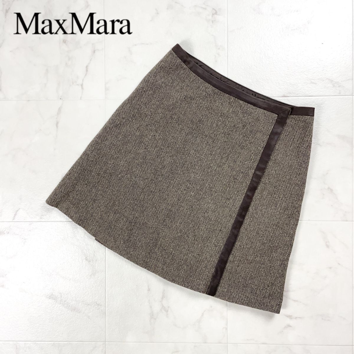 - 美品 Max Mara WEEK END LINE マックスマーラ ヘリンボーン台形ラップスカート 巻きスカート フレア 膝丈 ブラウン 茶色 サイズ36*GD329