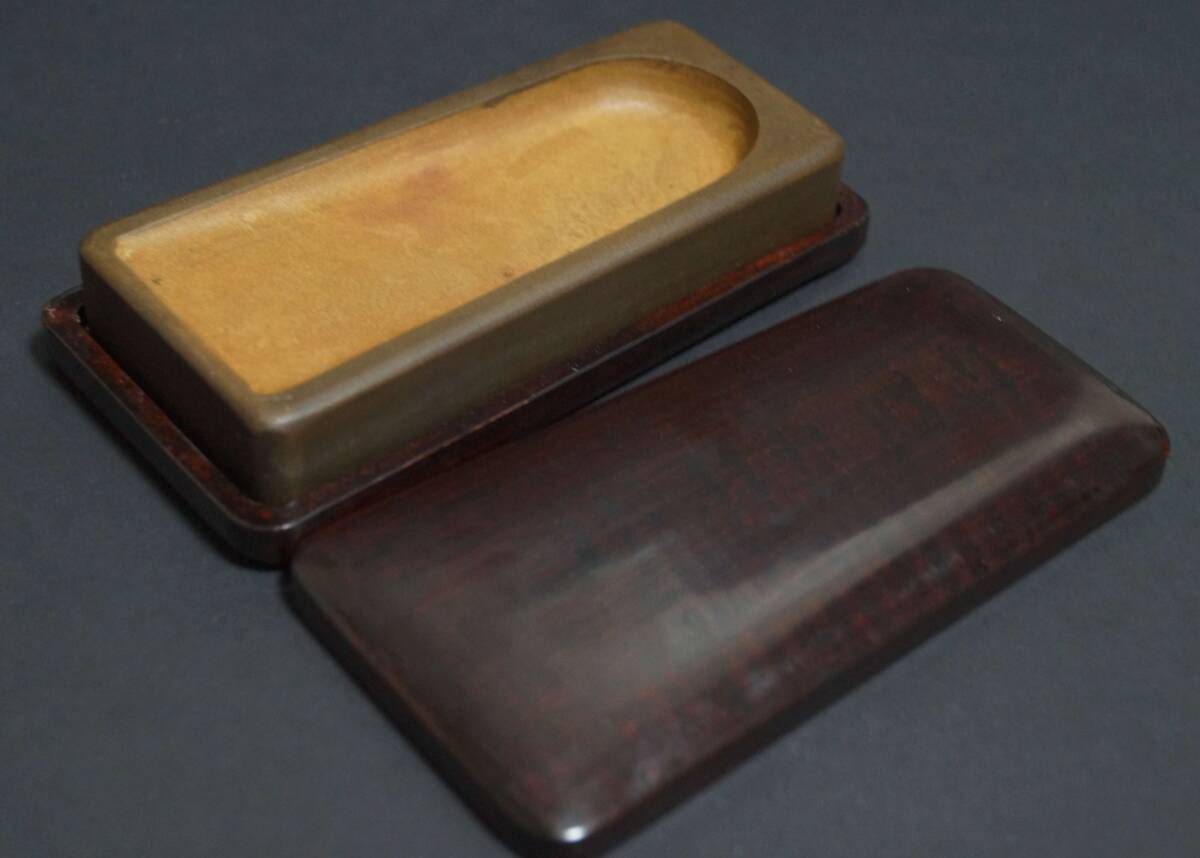 - 【閑】書道硯 中国硯 魚黄澄泥硯 斜面硯 すずり 唐硯 唐木硯蓋付 共箱★時代物★7D1016