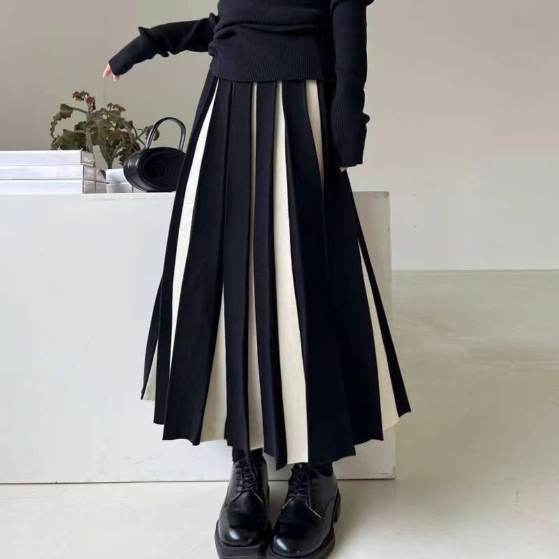 - プリーツスカート ロング丈 ニット 秋冬 レディース ストライプ Aライン バイカラー ニット 2color切り替え 体型カバー ブラック