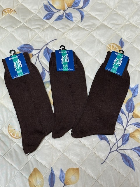 > ★★★★★未着用 7500 02 超破格値! 在庫処分特売! 絹100% シルク100% メンズ 靴下 3足セット 25~27cm ブラウン 茶 柄はおまかせ★★★