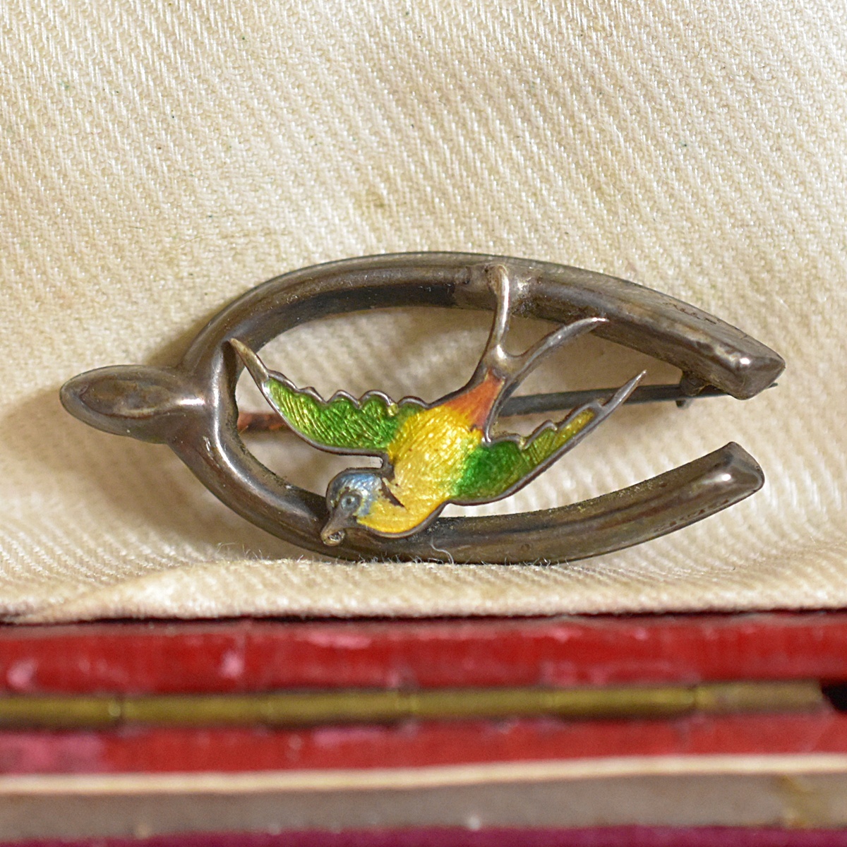 - アンティーク 多色使いエナメル/七宝の小鳥のウィッシュボーンブローチ シルバーメッキ 本物保証 19世紀後期~20世紀初頭ごろ