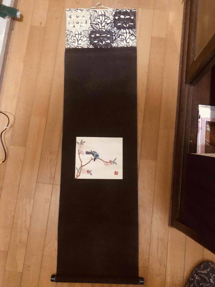 - 【掛軸・希少】総刺繍 掛軸 小鳥(鶯)? 梅?図 絹本 細密刺繍絵画 伝統工芸 額装可 127cm 古美術 茶掛け 書画 和モダン 床の間に