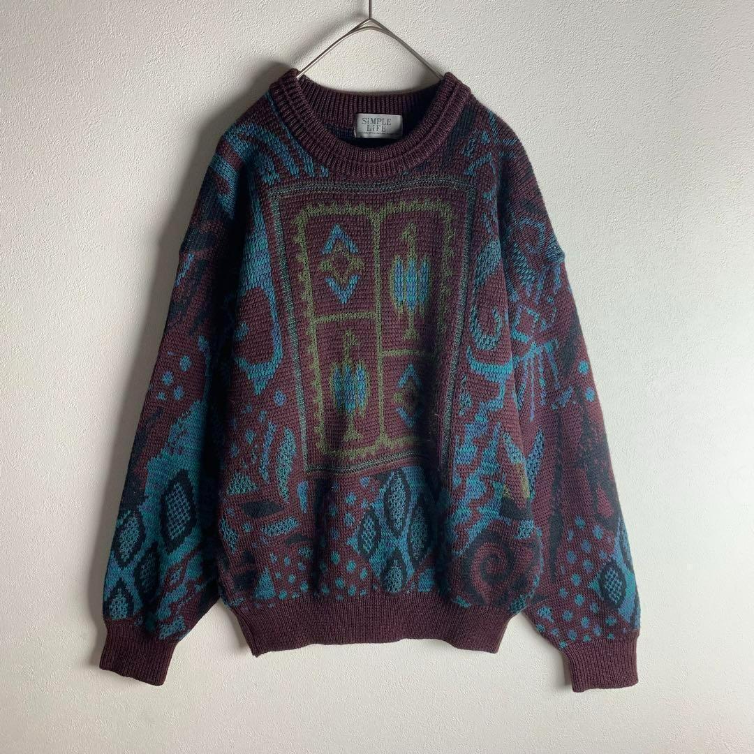 - ニット セーター ワインレッド ダークカラー 総柄 クレイジー柄 アシンメトリー お洒落 カジュアル メンズ 古着