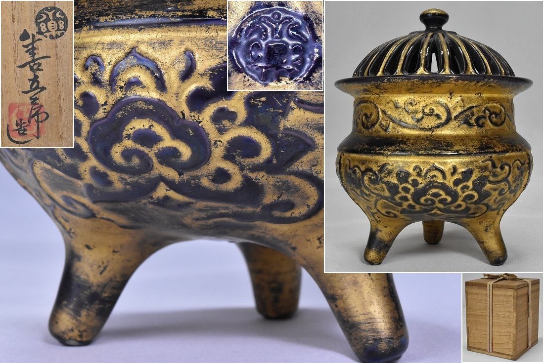 【永楽善五郎】紫交趾 金彩 唐草花文 香炉 共箱 茶道具