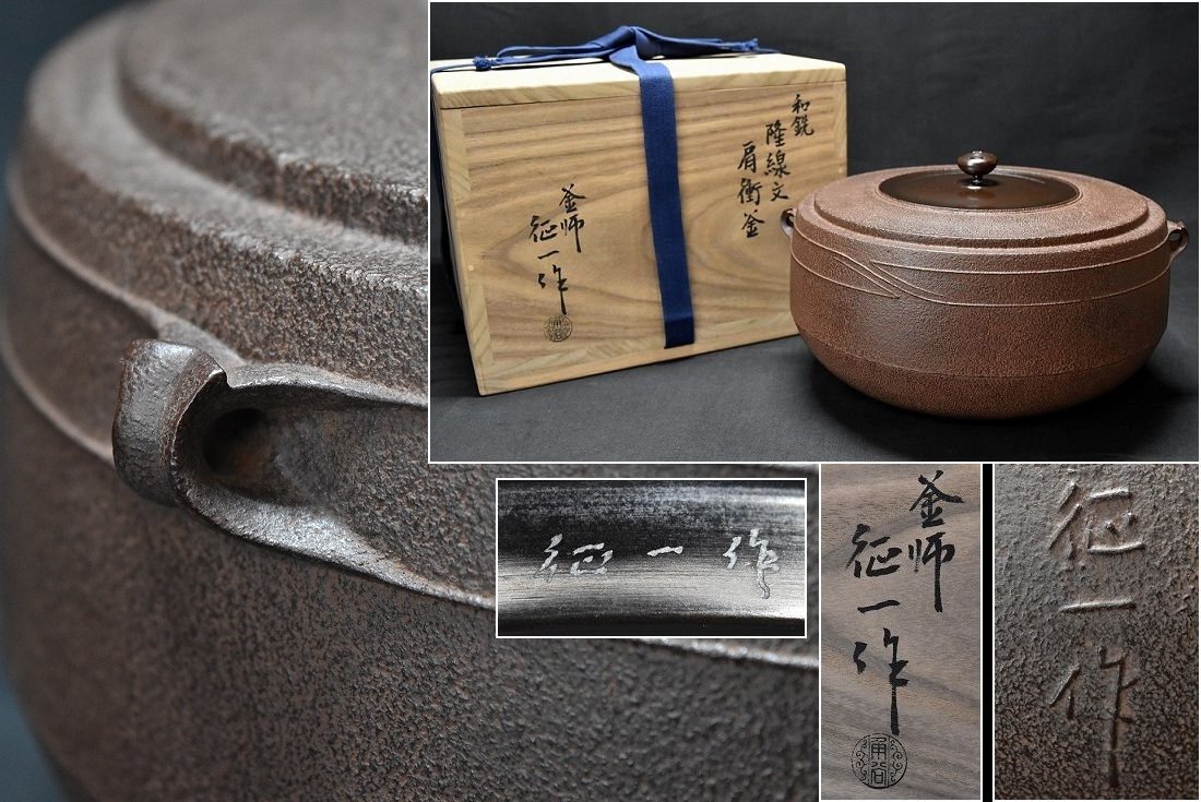 釜師 角谷征一 日刀保たたら 和銑 隆線文 肩衝釜 共箱 共布 人間国宝角谷 一圭の長男 茶道具