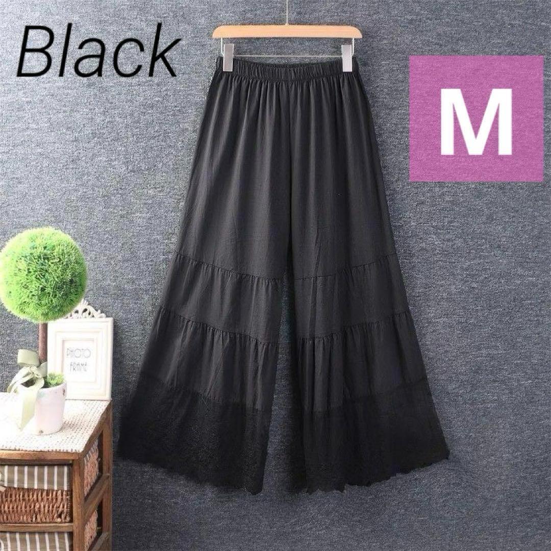 - 重ね着 レース付 ロング ペチコート パンツ Mサイズ ズボン ブラック 黒