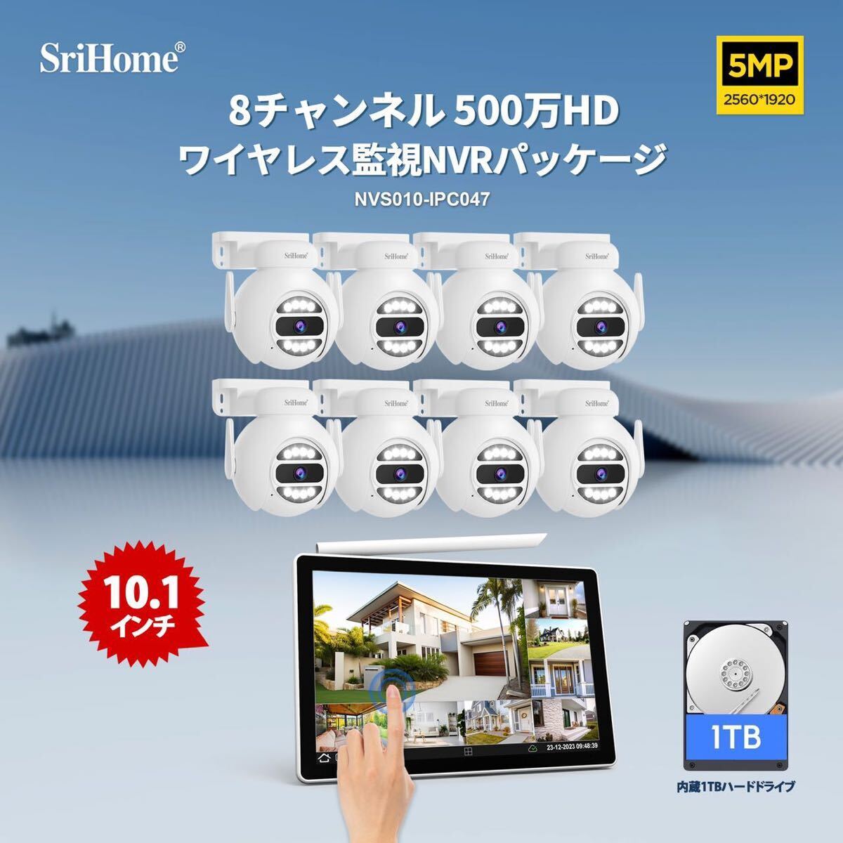 > ★送料無料・30日間保証付き★Srihomeワイヤレス防犯カメラ8台セット 500万画素 最新タッチパネル 1TB HDD内蔵付き & H.265+映像圧縮技術