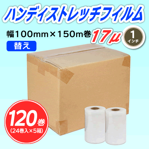 - 【120巻】ハンディストレッチフィルム 《替え》 100mm幅×150m巻 厚さ17μ 透明 1インチ紙管 (代引不可)