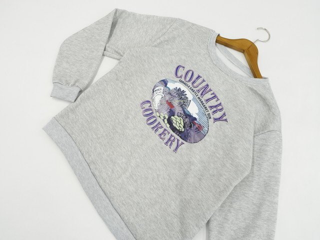 - 美品 メゾン ド テレーズ MAISON DE THERESE 長袖 ラウンドネック トレーナー グレー地 イラスト プリント&パープル 英字プリント