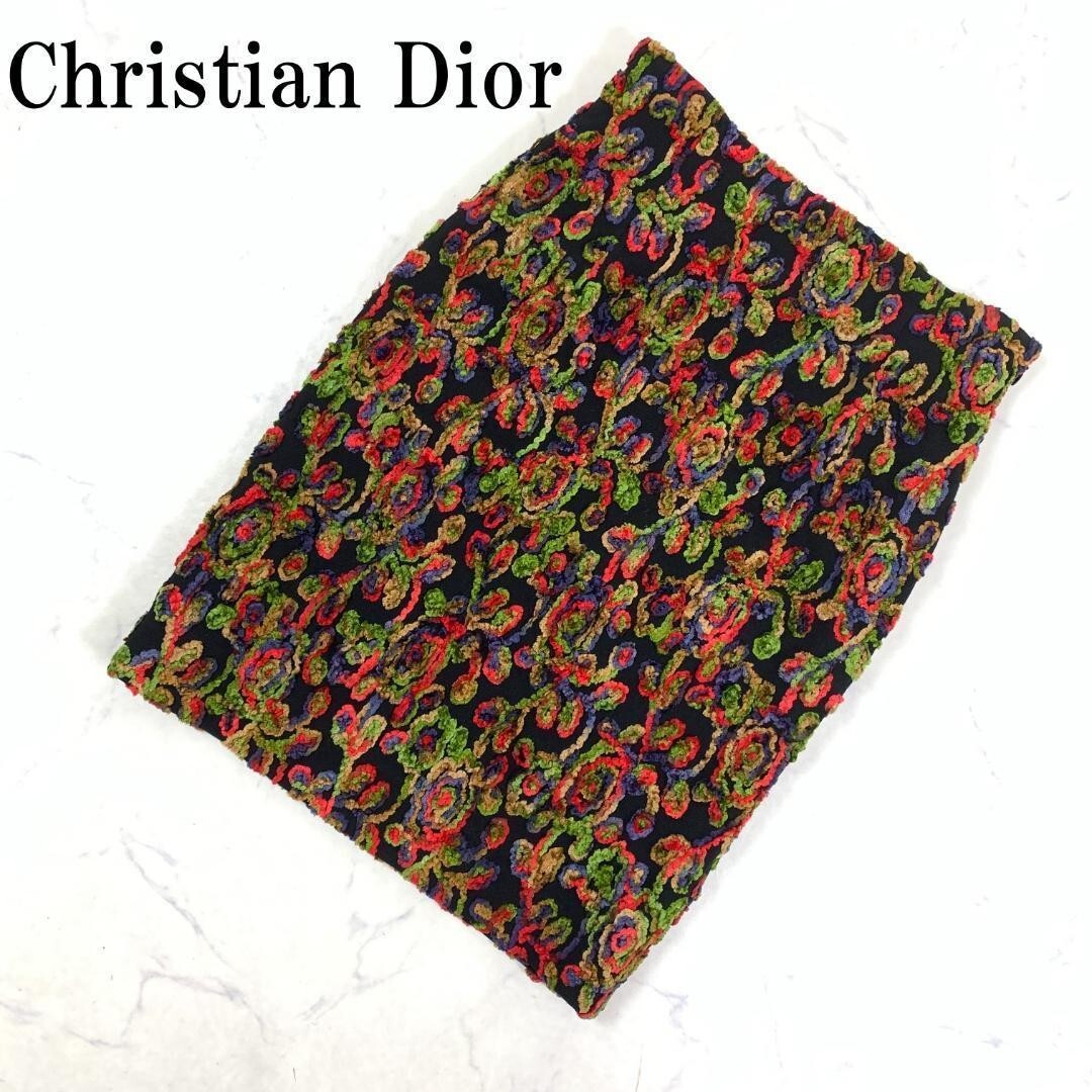 > LA7799 クリスチャンディオール Christian Dior ストレッチ有 ポケット無し 立体感 総柄 モール タイトスカート ネイビー 綿 L