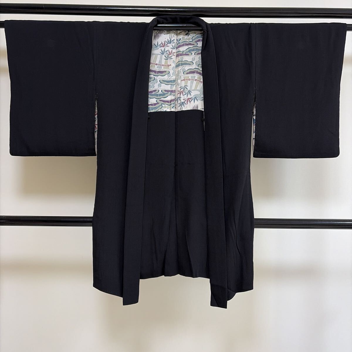 > ■E5371■アンティーク■正絹縮緬■黒 無地 一つ紋 袷 長羽織■身丈100 裄64