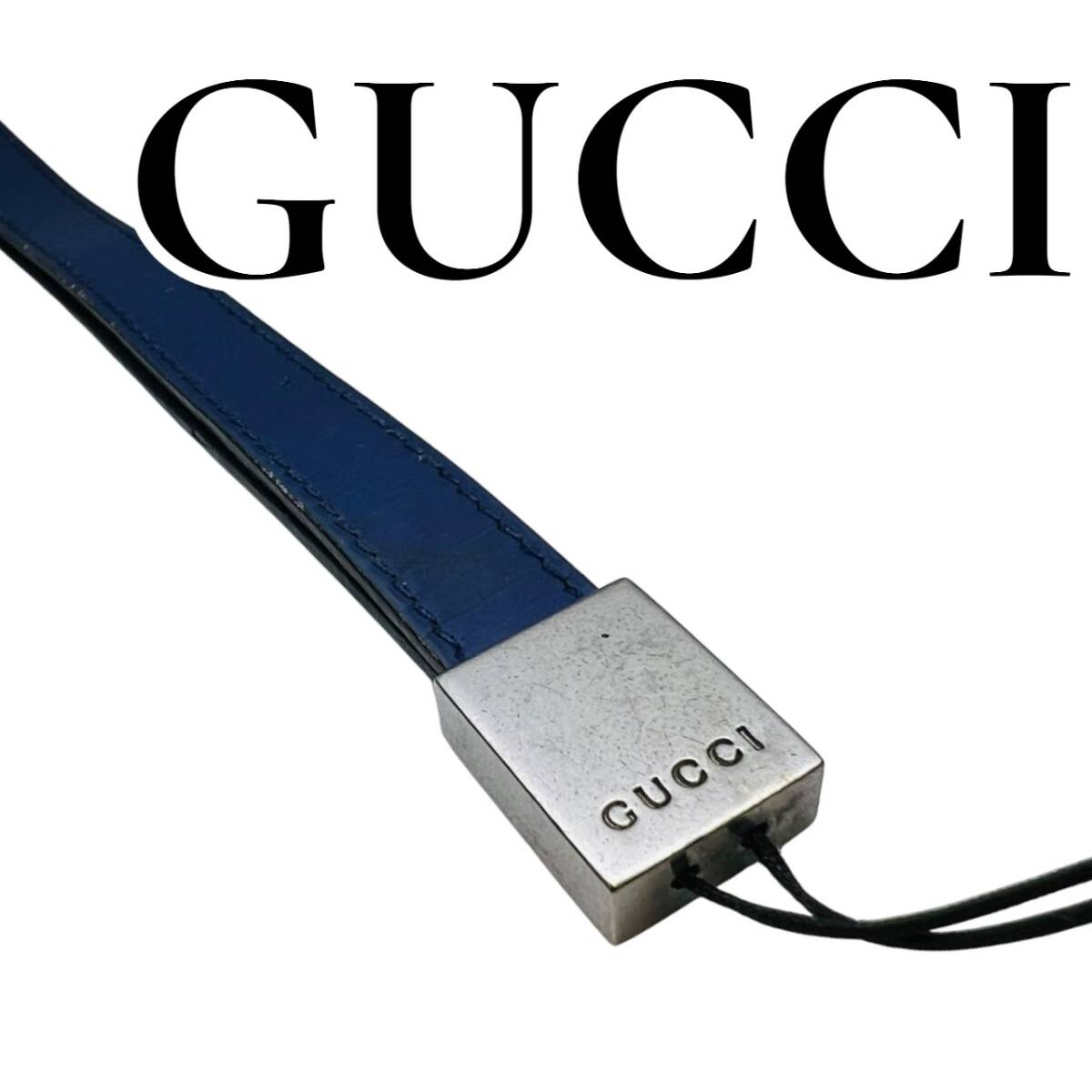 - 【良品】GUCCI ストラップ キーホルダー レザー 紺 シンプル シルバー金具