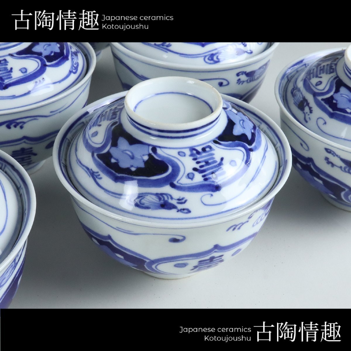 > 【古陶情趣】明治期~大正期 瀬戸焼 染付 蓋茶碗 10客 料亭 懐石 ホテル 旅館 日本料理 居酒屋 8462vhzS