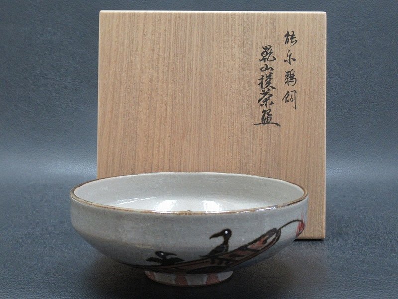 > D3104 岡田佳山 粟田焼 能楽 鵜飼 乾山模 茶碗 抹茶碗 平茶碗 茶器 茶道具 共箱