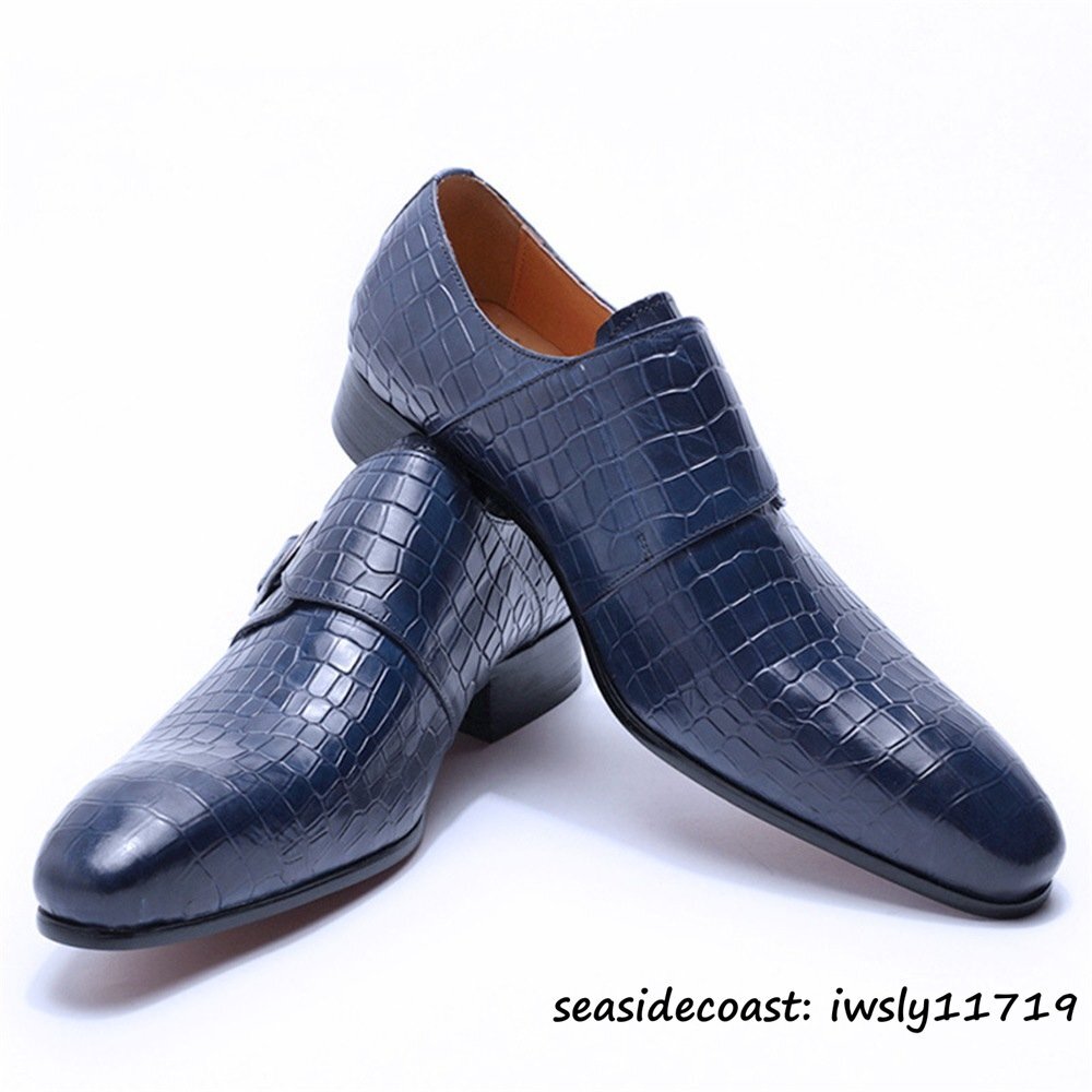 - 定価10万★ビジネスシューズ 最高級 モンクストラップ メンズ レザーシューズ本革 紳士靴 職人手作り イタリア 鰐柄 革靴 ブルー 26.5cm
