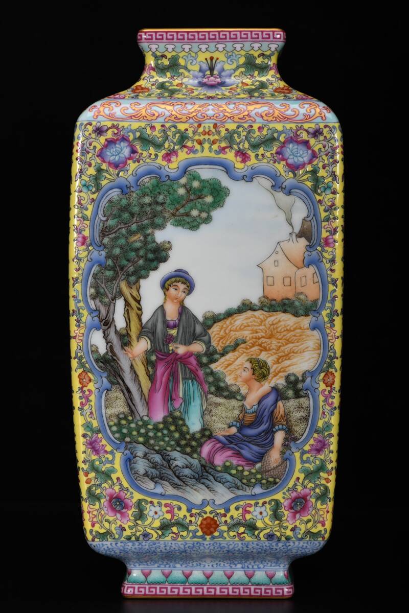 - ◆珍蔵◆中国古美術 清乾隆年製款 琺瑯彩 古陶磁 黄地 西洋人物四方踪式瓶 細密細工造 置物 擺件 古賞物 骨董品 時代物 A02
