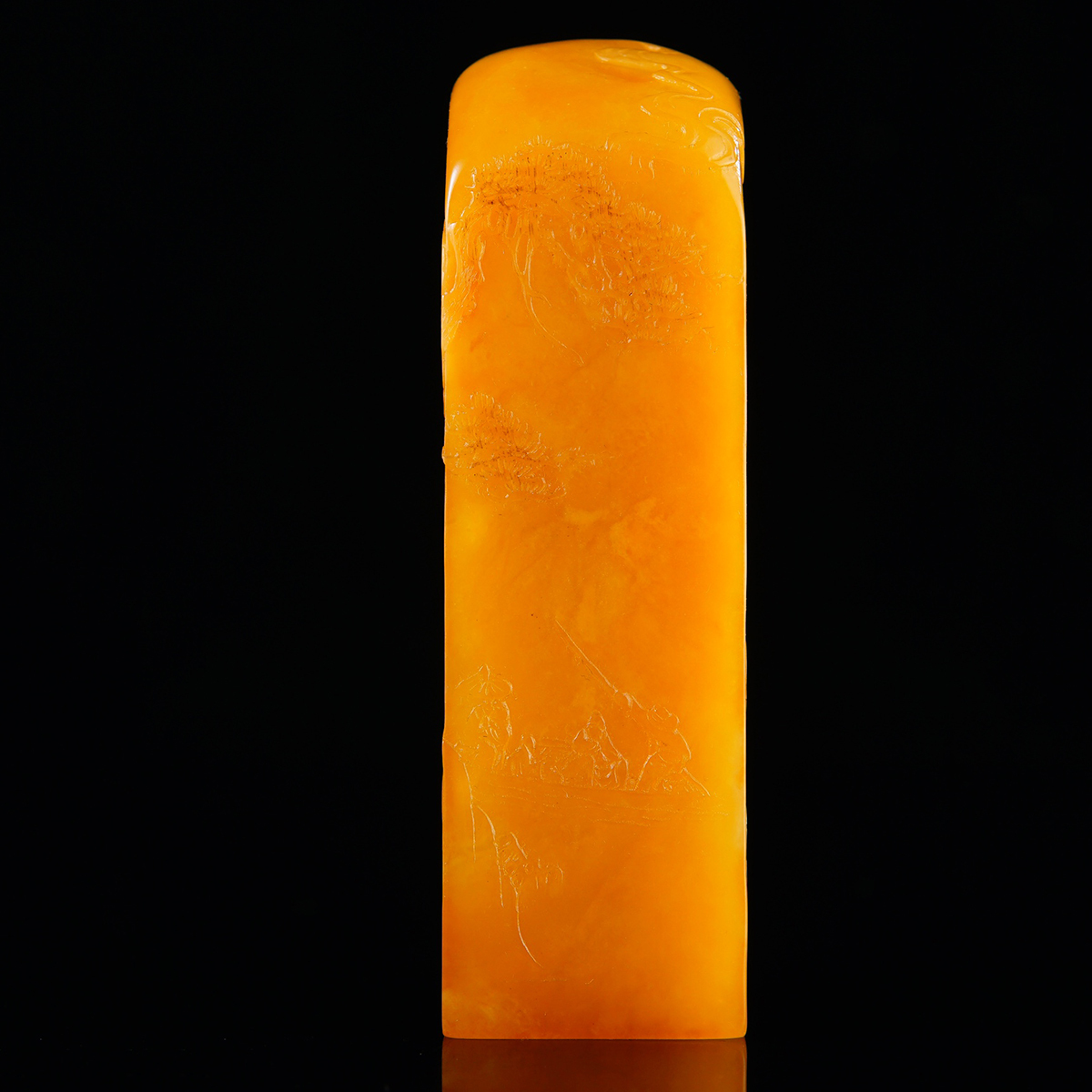 - ▽鴻▽金石篆刻 寿山石 田黄石彫 泛舟図素章 印材 箱付 時代物 中国古美術 骨董品