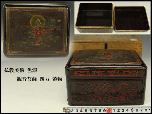 - 【銀閣】仏教美術 色漆 観音菩薩 四方 蓋物 旧家蔵出 送料無料(ZD961)