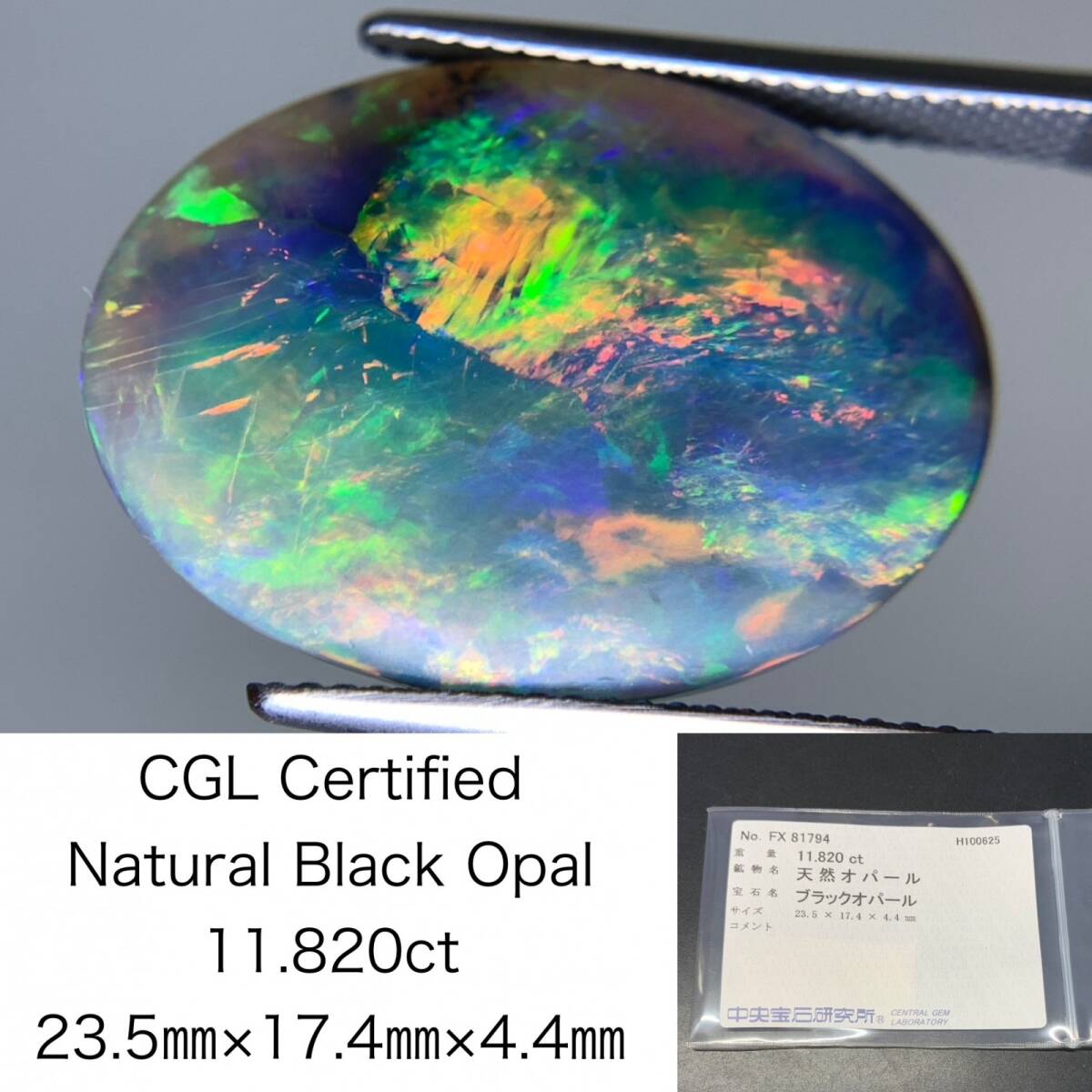- ブラックオパール 天然 11.820ct 中央宝石ソーティング付き 23.5×17.4×4.4 ルース( 裸石 ) 6965Y