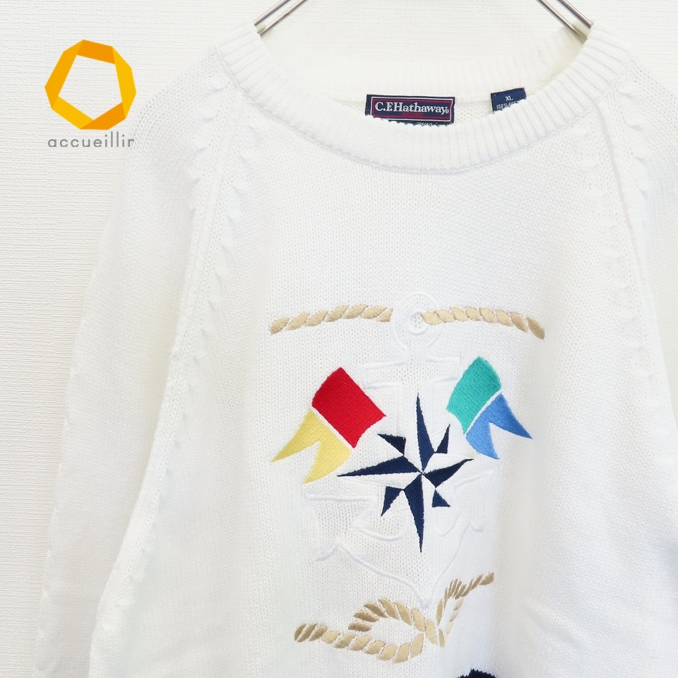 【ブランド】C.F.ハサウェイ C. F. Hathaway【アイテム】セーター【表記サイズ】XL【平置き実寸】裄丈:約 83cm身幅:約 60cm着丈:約 68cm【状態】やや傷や汚れあり【備考】フロント刺繍部分にごく薄い汚れあり(画像参照)【色】ホワイト系【素材】画像をご参照くださいキーワード/アクイール/古着/used/ビンテージ/ヴィンテージ/vintage/昭和/レトロ/サマーセーター/刺繍/マリンテイスト/