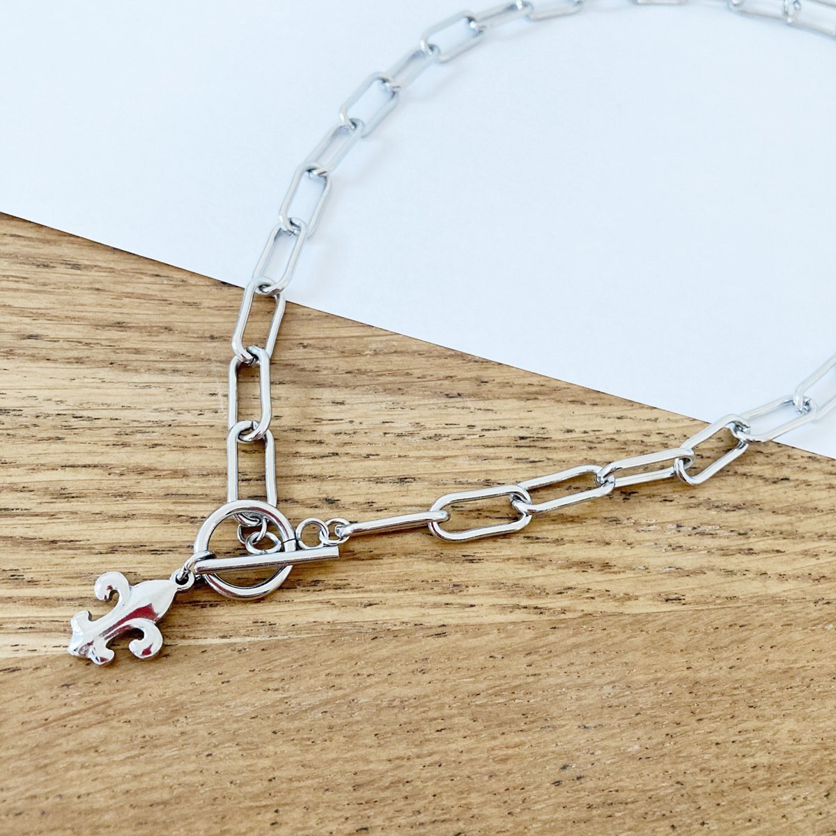 - ステンレス製 百合の紋章チャームマンテルネックレスチョーカー ロング小豆チェーン 幅約7.5mm 35cm MN06