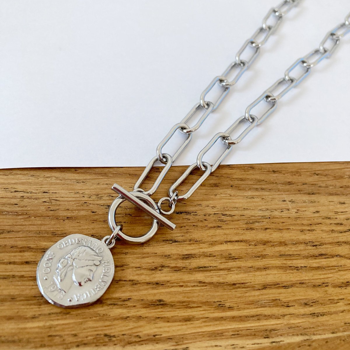 - ステンレス製 コインチャームマンテルネックレスチョーカー ロング小豆チェーン 幅約7.5mm 35cm MN03