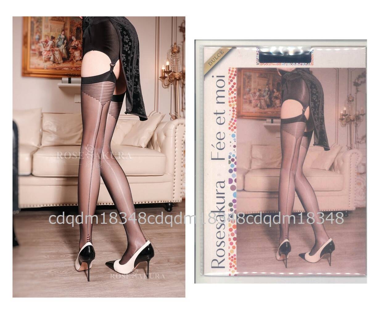 - ROSESAKURA/7630 超光沢黒バックシームボーダー柄ありガーターストッキング足型あり