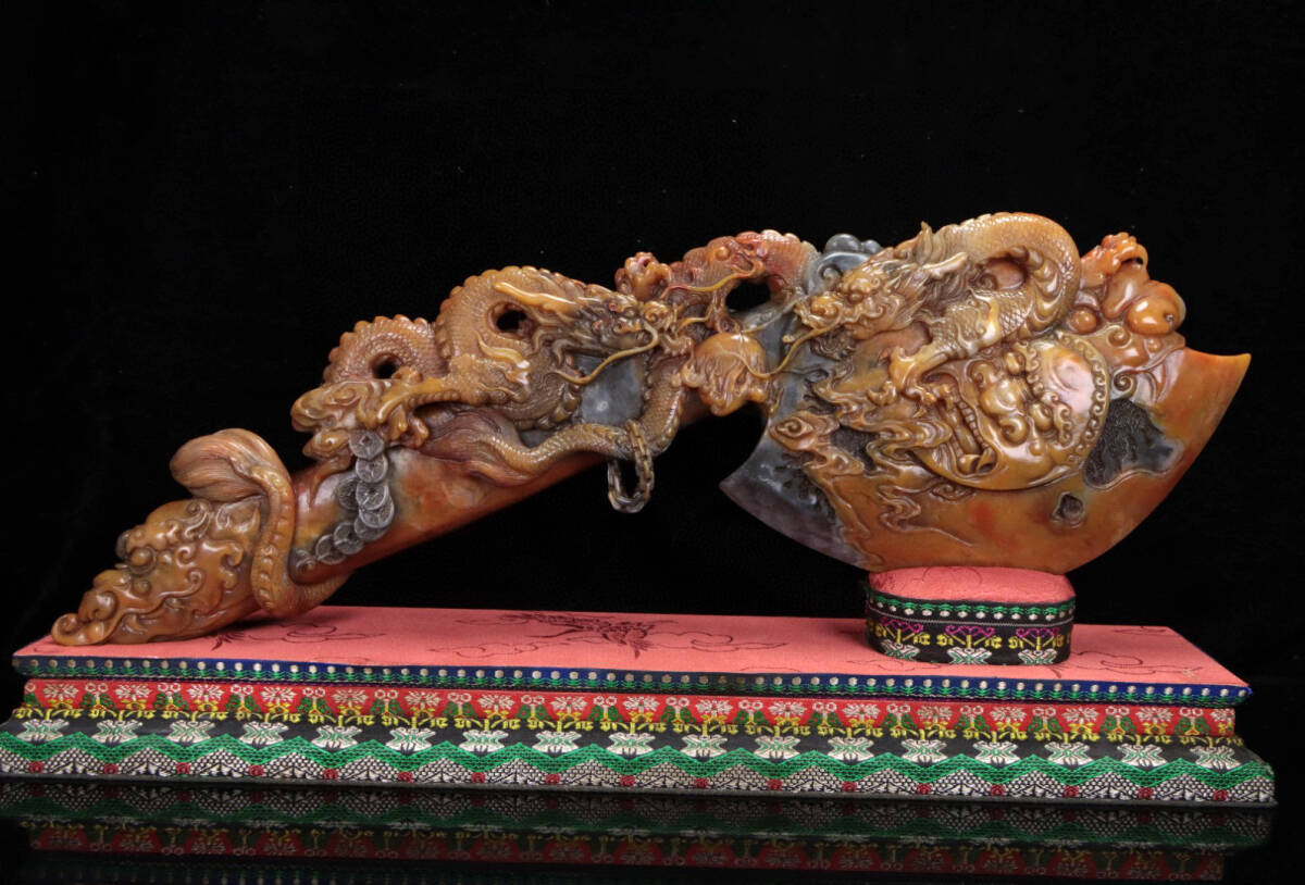 - ▽鴻▽清朝時代 寿山石 黒田黄石彫 府上有龍置物 尚均作 箱付 時代物 中国古美術 骨董品