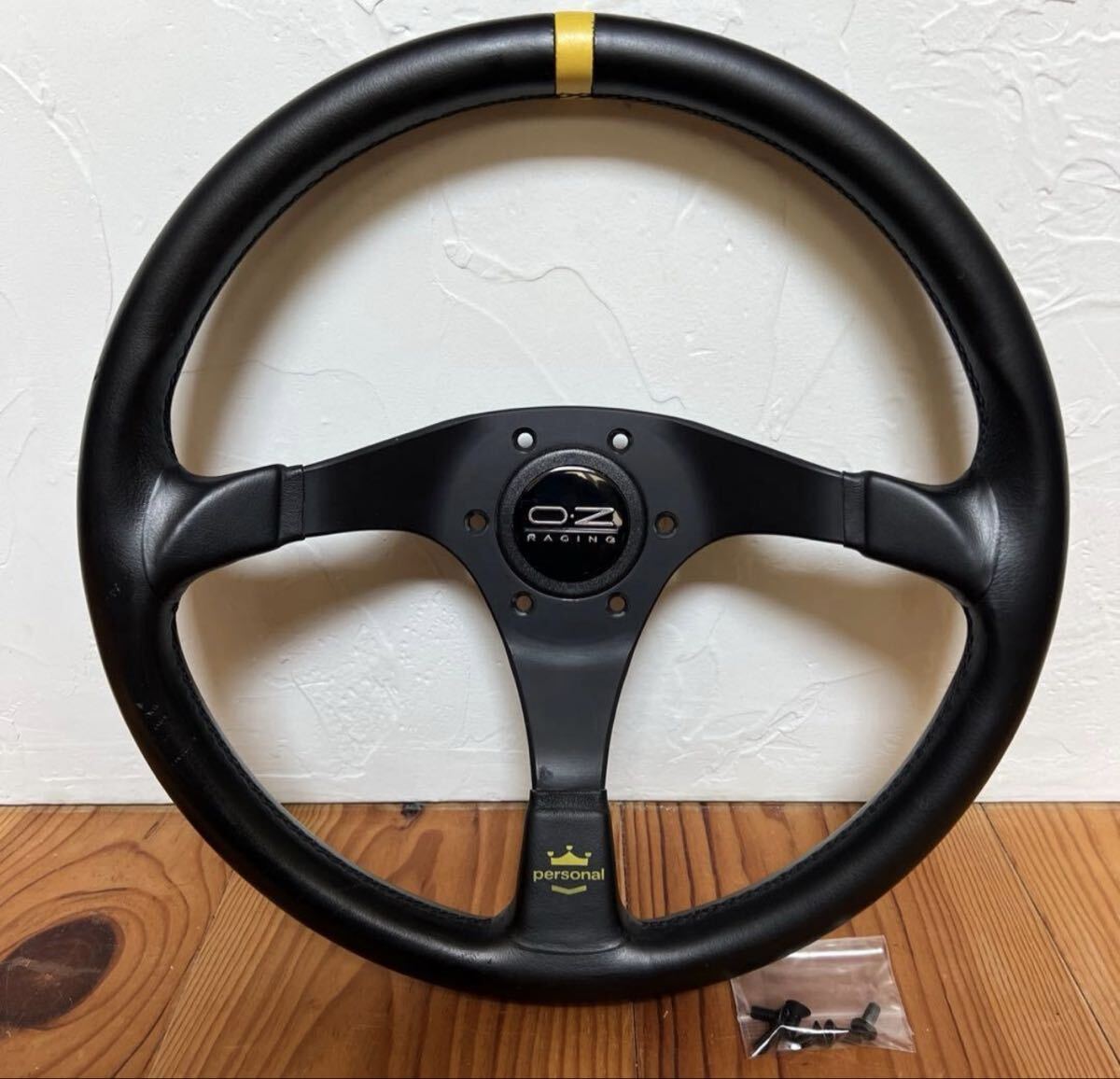 > パーソナル 正規品 小径ステアリング イタリア製 レザー整備済 φ35 トロフィー(NARDI フェラーリ仕様 ブラックステッチ/イエローロゴ)