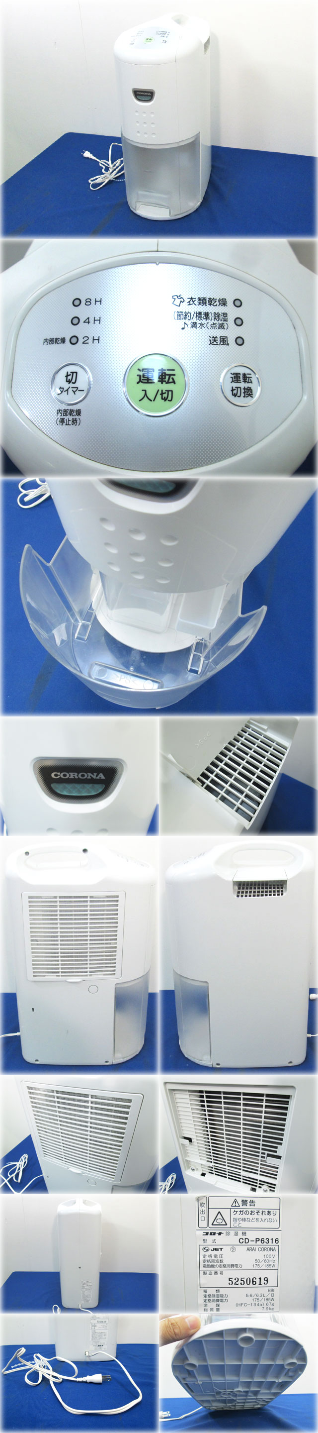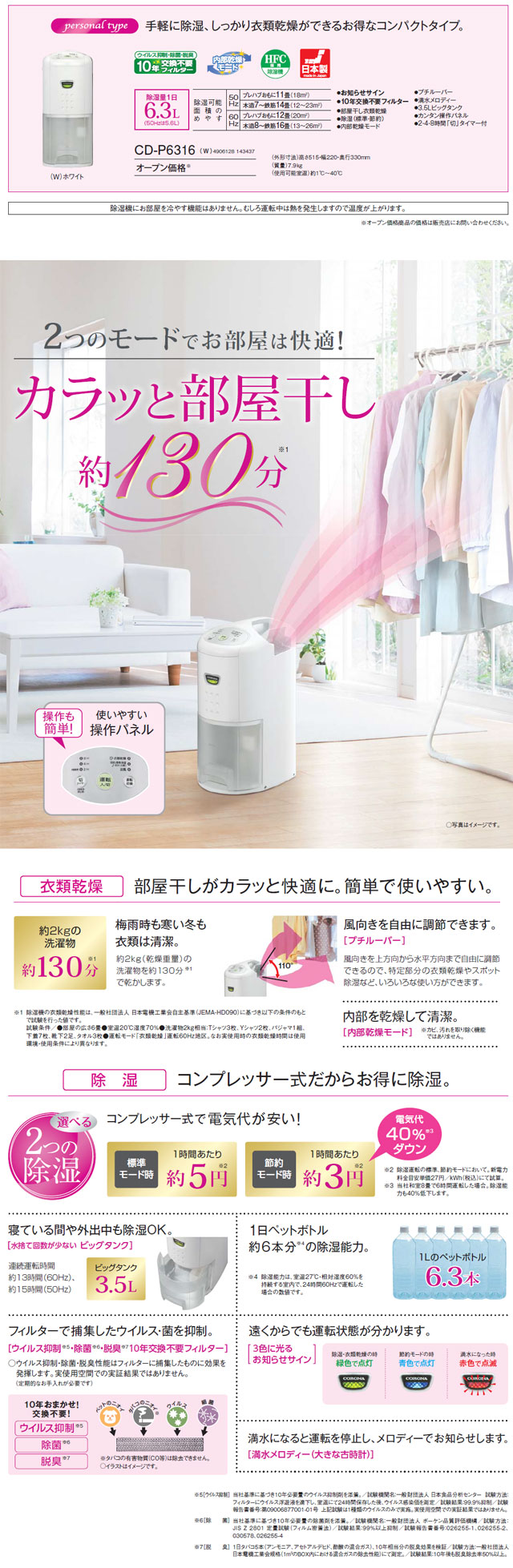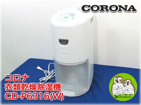 - コロナ 衣類乾燥除湿機 CD-P6316(W) コンプレッサー式 除湿能力5.6/6.3L/日 3.5Lビッグタンク プチルーバー 満水メロディー 【長野発】