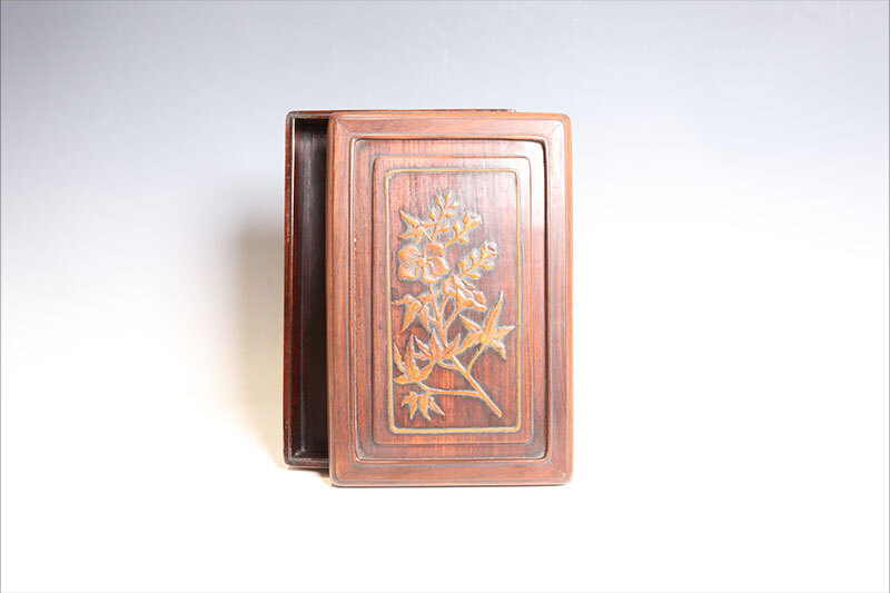 - 中国美術 唐木黄楊木象嵌花卉紋 硯箱 蓋盒 (R964)