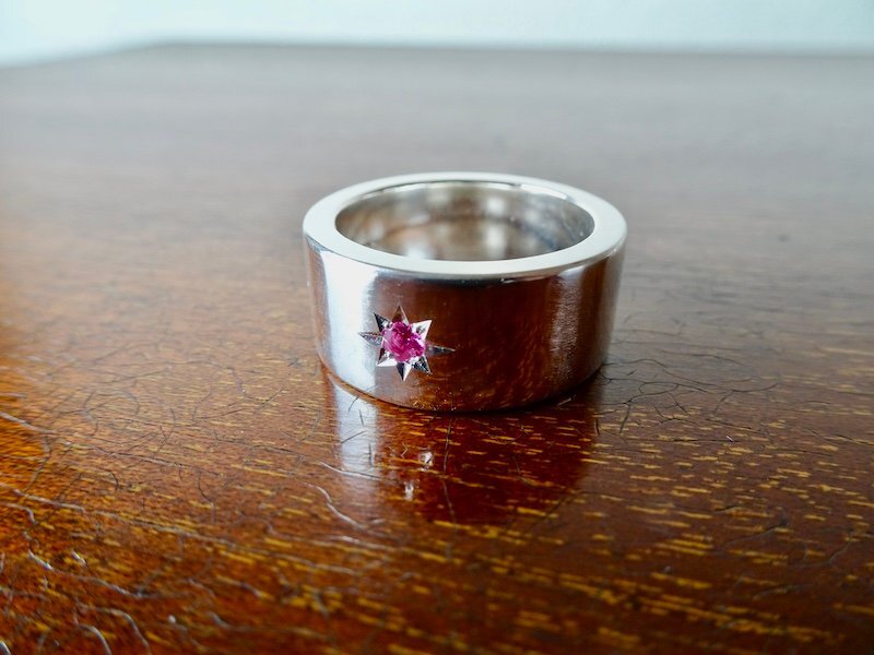 - 仁尾彫金『一つ星2.7mmピンクスピネル、幅1cm、プラチナ平打リング』ハンドメイド273