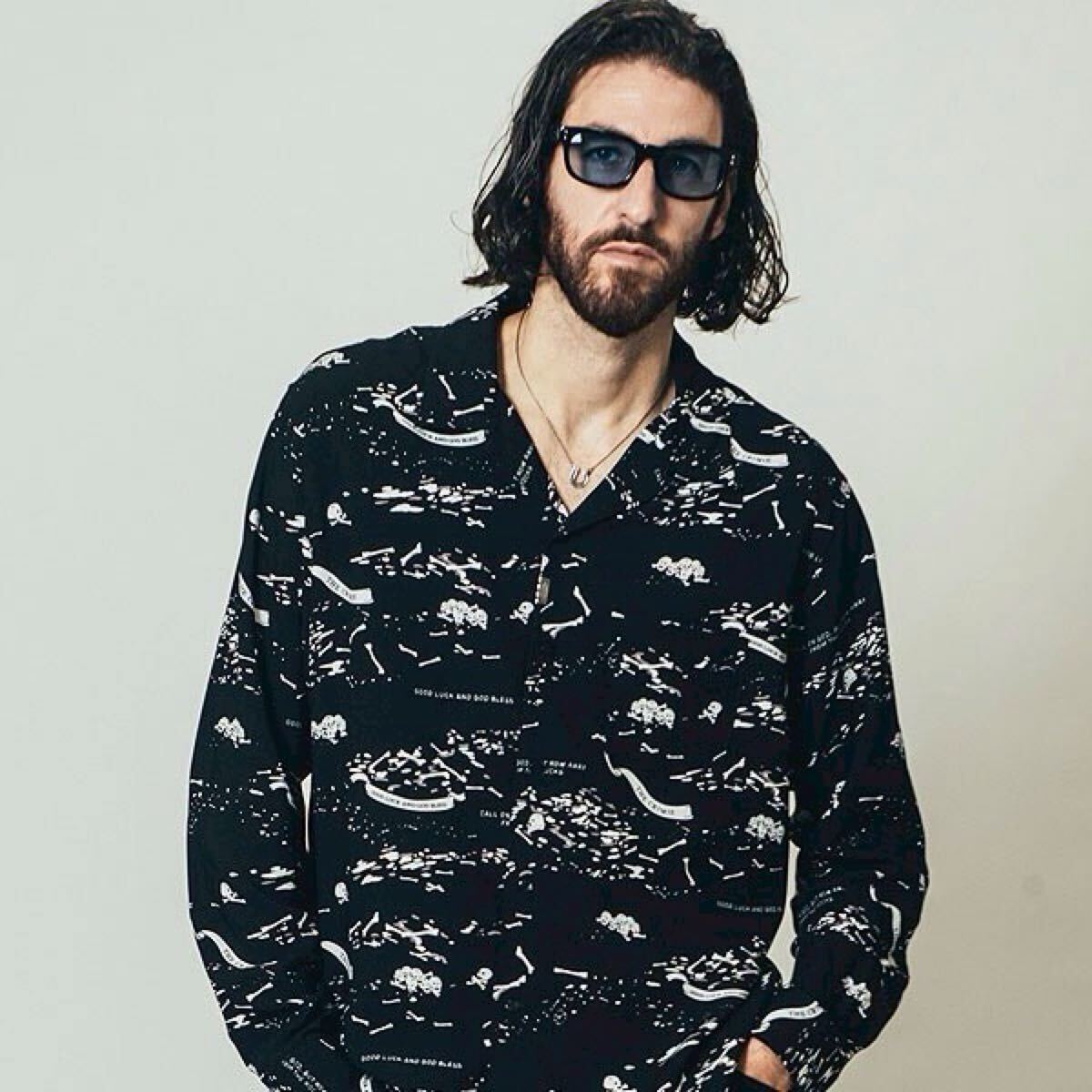 > 【700】 美品 CRIMIE スカル ボーン レーヨン オープンカラー シャツ ピースマーク ブラック L 黒 black クライミー skull shirt アロハ