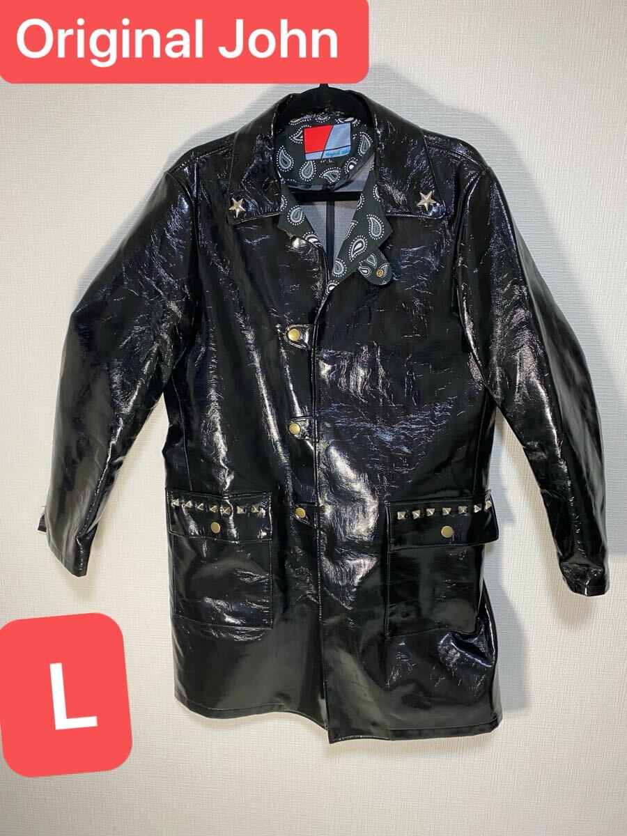 - Original John フェイクレザーコート ペイズリー裏地 スタッズ調 L レザージャケット カーコート ジャケット ブラック